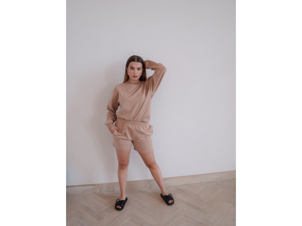 Teplákové kraťasy jsou volnějšího střihu s kapsami ve švu, příjemně padnou přes boky a v pase mají měkkou gumu, aby hezky seděly. Mají vyšší pas, hezky navazují na volnější mikinu do setu, tu najdete ZDE.